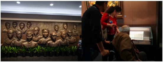 走進"一大"會址,首先映入眼簾的是13位中共代表及2位共產(chǎn)國際代表銅頭像。他們是毛澤東、何叔衡、董必武、陳潭秋、王盡美、鄧恩銘、李達、李漢俊、張國燾、劉仁靜、陳公博、周佛海、包惠僧及荷蘭人馬林和俄羅斯人尼柯爾斯基,左手邊是巨幅黨旗,重溫入黨誓詞,激情澎湃,激蕩回響。忽然,我看見一位老人坐著輪椅被推到成列窗前,旁邊的女子大聲給老人講解并手指相片,可能老人耳朵聽不清,久久凝視,用顫抖的右手撫摸著放照片的成列窗玻璃,張張嘴,笑了。這一場景我的心顫了,我看到老人眼里含著淚笑,而我卻哭了……