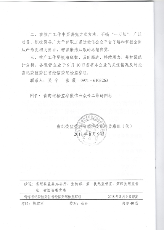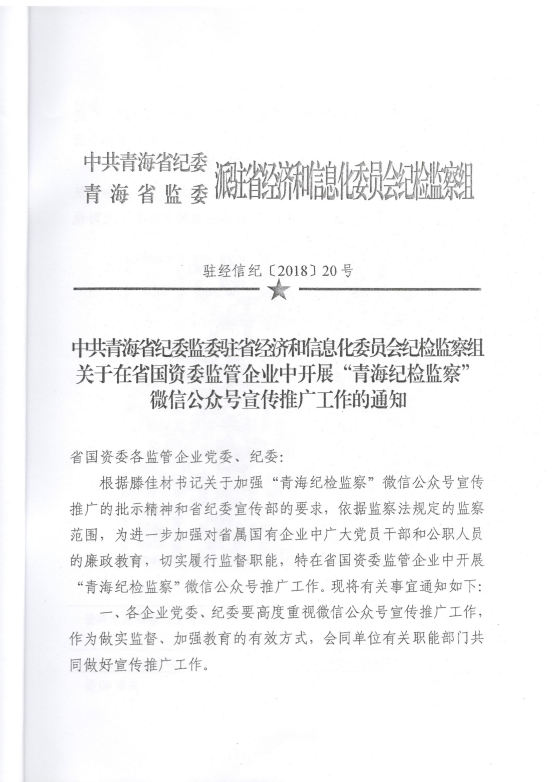 轉(zhuǎn)發(fā)《關(guān)于在省國(guó)資委監(jiān)管企業(yè)中開(kāi)展“青海紀(jì)檢監(jiān)察”微信公眾號(hào)宣傳推廣工作》的通知