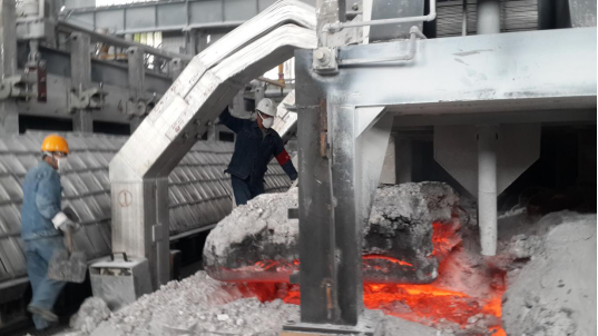 待多功能天車將殘極調(diào)出,趙德福高溫下的"高溫作業(yè)"才算正式開始。因為殘極調(diào)出后裸露出火紅的、溫度高達(dá)900多攝氏度的爐膛。趙德福用大勾、大耙等工具將大小不一的殘極塊一一撈出,確認(rèn)爐膛干凈后,指揮多功能天車裝入新陽極,張壽昌、劉強(qiáng)負(fù)責(zé)添加保溫料、殼面整形等。