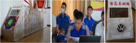 西柏坡精神是部生動的教科書,車間工人黨員袁有德利用平時裝配件的紙盒子,創(chuàng)意性地制做了一列"團(tuán)結(jié)奮進(jìn)號"火車,邀請黨員一起乘車前行。袁有德說:"團(tuán)結(jié)奮進(jìn)號"列車蘊(yùn)含著學(xué)習(xí)西柏坡精神,強(qiáng)企富家、團(tuán)結(jié)奮進(jìn)的寓意,車頭前面的"大眾"標(biāo)識代表公司經(jīng)營的品牌;八個綠色的大美孚機(jī)油蓋代表八方來財,所有蓋口都向外代表招攬客戶,減少流失,而且像螺絲釘一樣牢牢釘?。≤囶^車尾標(biāo)有"勿忘來時路"的字樣,以此提醒廣大黨員干部不忘初心、牢記使命,一定不要忘記來時的路,回顧過去,展望未來,讓"團(tuán)結(jié)奮進(jìn)"號列車在西柏坡精神的感召下前行。支部要求,在疫情防控和汽車行車嚴(yán)竣的形勢下,我們每一個物產(chǎn)汽貿(mào)員工都是新時代的答卷者,讓"團(tuán)結(jié)奮進(jìn)號"奔馳在新時代的征程上,承載著中國夢、物產(chǎn)夢,承載著物產(chǎn)汽貿(mào)職工群眾對美好生活的向往,風(fēng)馳電掣,勇往直前,奔向未來!