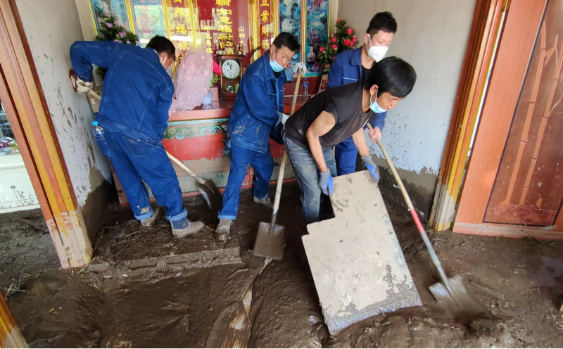 在救災(zāi)現(xiàn)場,公司抗洪救災(zāi)突擊隊(duì)和先鋒隊(duì)員,充分發(fā)揚(yáng)“不怕苦、不怕累,敢奉獻(xiàn)、勇?lián)?dāng)”的精神,按照“8.18”山洪災(zāi)害搶險(xiǎn)救援處置工作應(yīng)急指揮部的統(tǒng)一安排,迅速投入到清除淤泥和道路清障等工作。大家不間歇地用鐵鍬清、用架子車?yán)?,兩天共清理十家住戶和三戶商鋪的屋?nèi)外淤泥,裝運(yùn)泥漿20余噸。