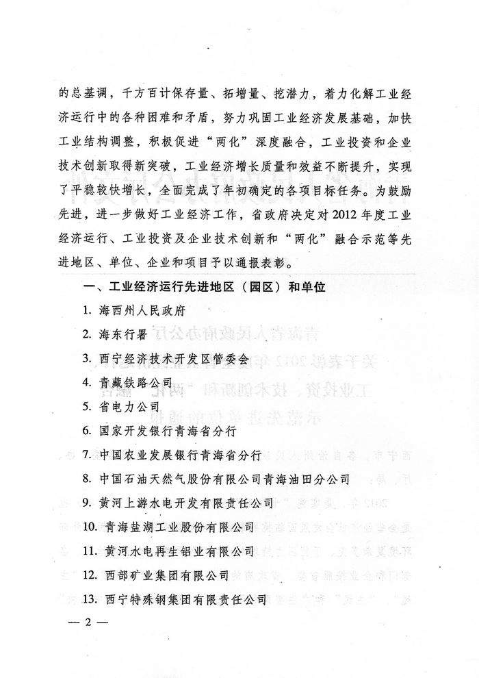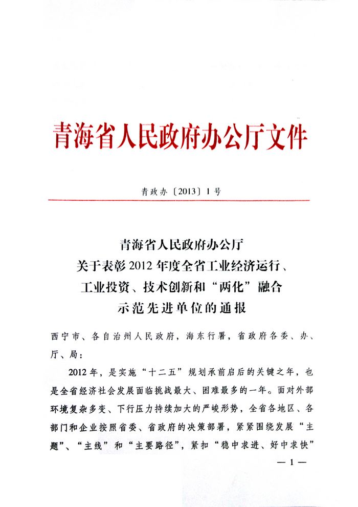 2012年,青海省物產(chǎn)集團總公司在省委、省政府及省國資委的大力支持和領導下,集團總公司按照全省工業(yè)經(jīng)濟總體部署和要求,著力推進工業(yè)項目建設,榮獲"2012年度工業(yè)投資貢獻獎"。