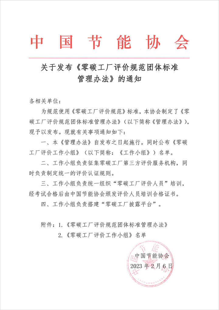 關(guān)于發(fā)布《零碳工廠評價規(guī)范團(tuán)體標(biāo)準(zhǔn)管理辦法》的通知