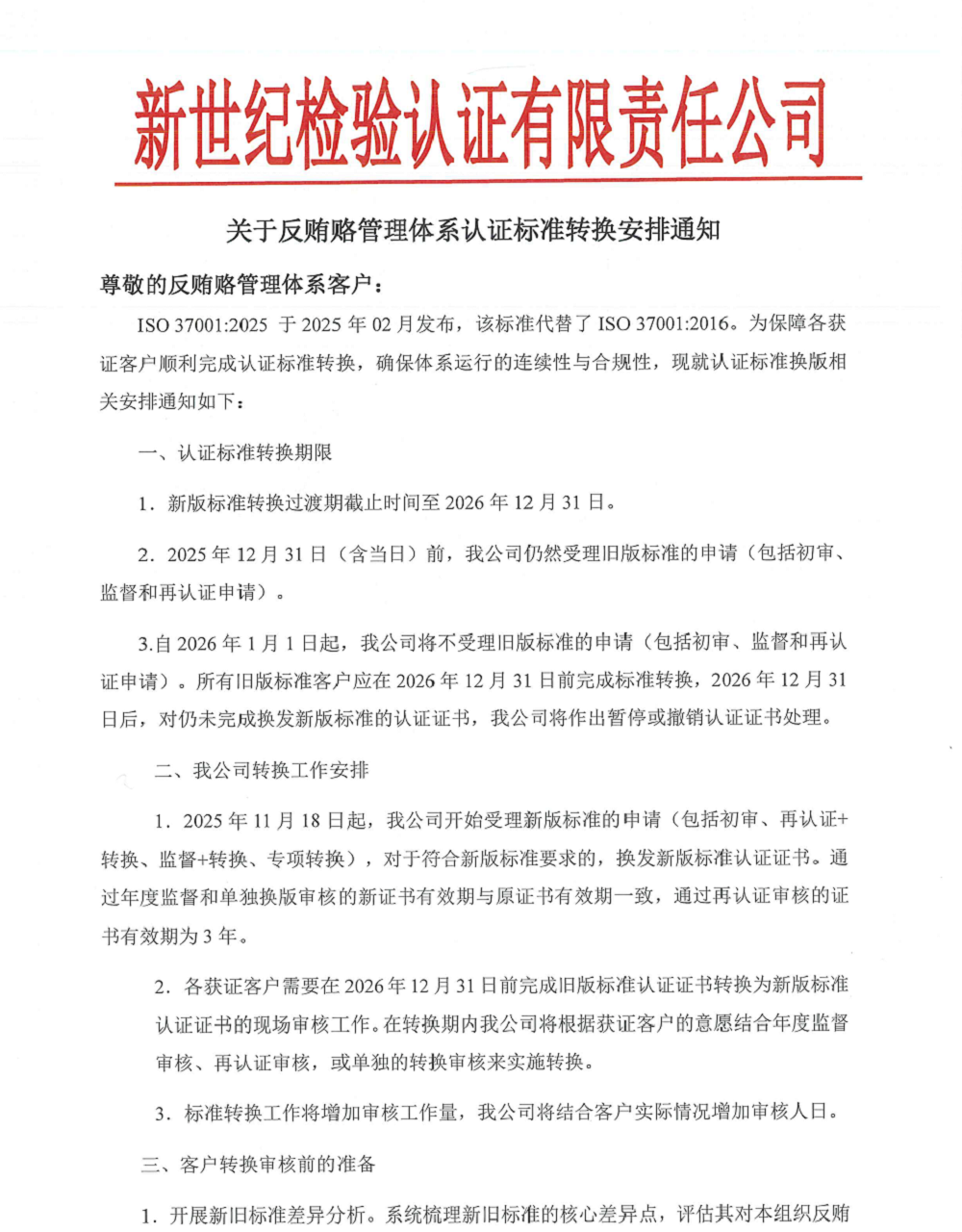 3.自2026年1月1日起,我公司將不受理舊版標(biāo)準(zhǔn)的申請(qǐng)(包括初審、監(jiān)督和再認(rèn)證申請(qǐng))。所有舊版標(biāo)準(zhǔn)客戶應(yīng)在2026年12月31日前完成標(biāo)準(zhǔn)轉(zhuǎn)換,2026年12月31日后,對(duì)仍未完成換發(fā)新版標(biāo)準(zhǔn)的認(rèn)證證書,我公司將作出暫停或撤銷認(rèn)證證書處理。